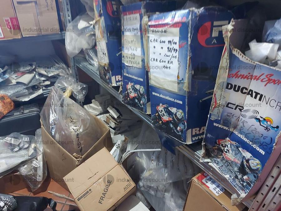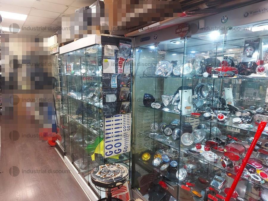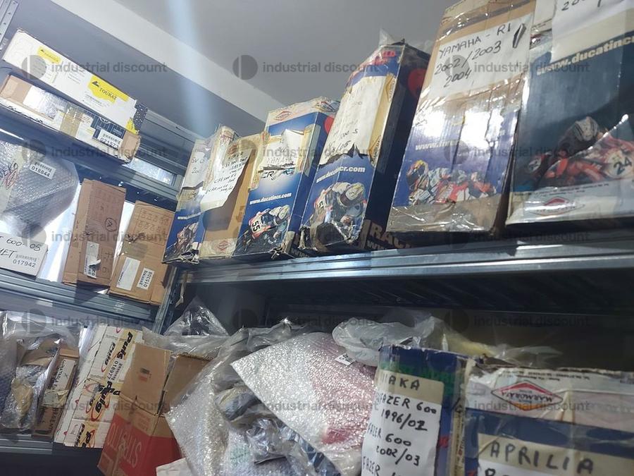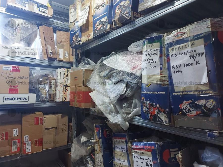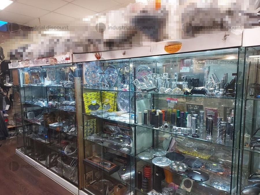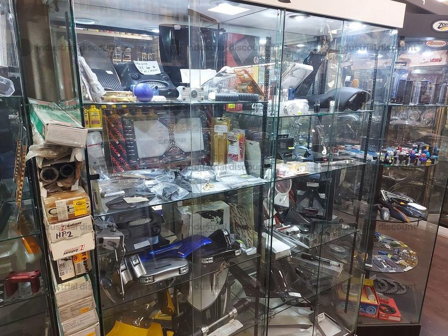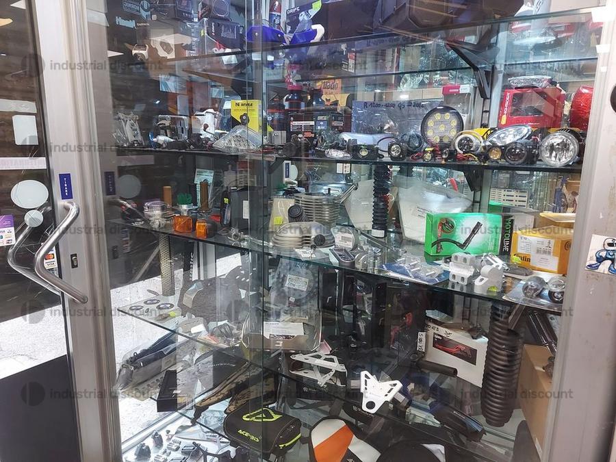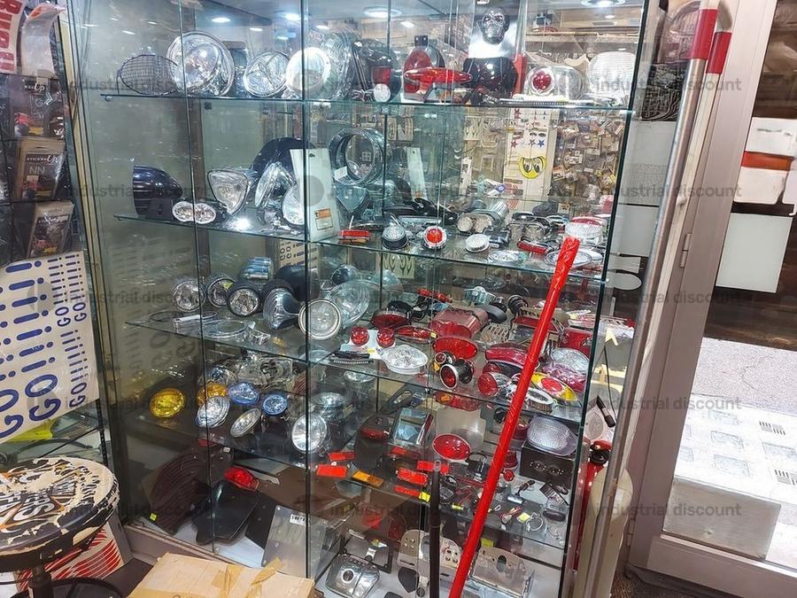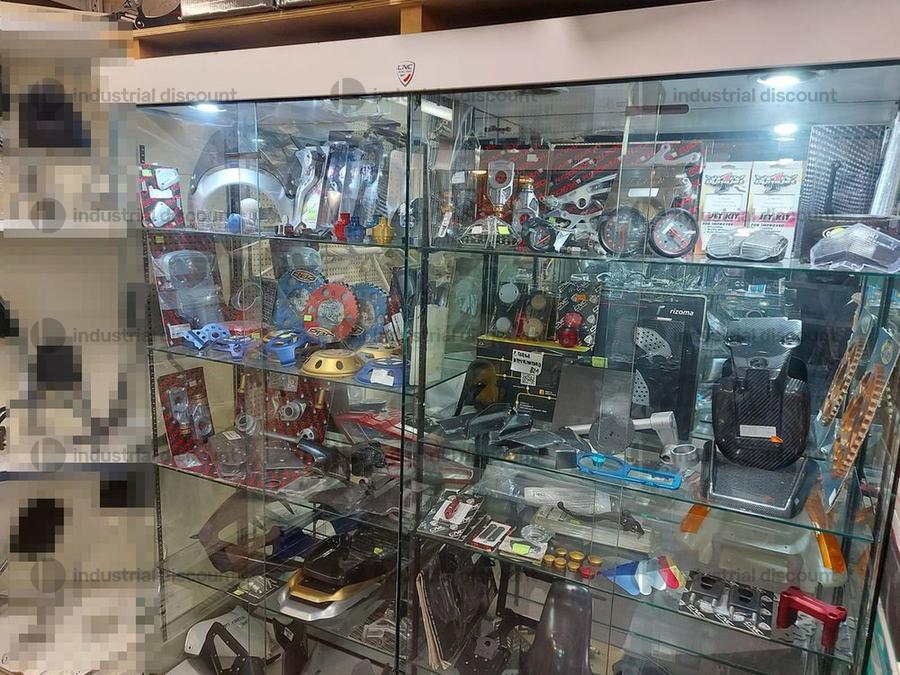 Accessori, ricambi per moto, comprensivi delle scaffalature che li contengono.