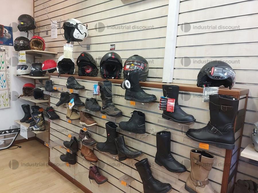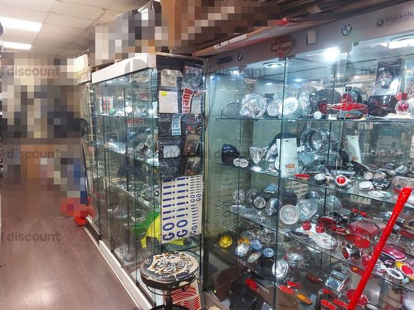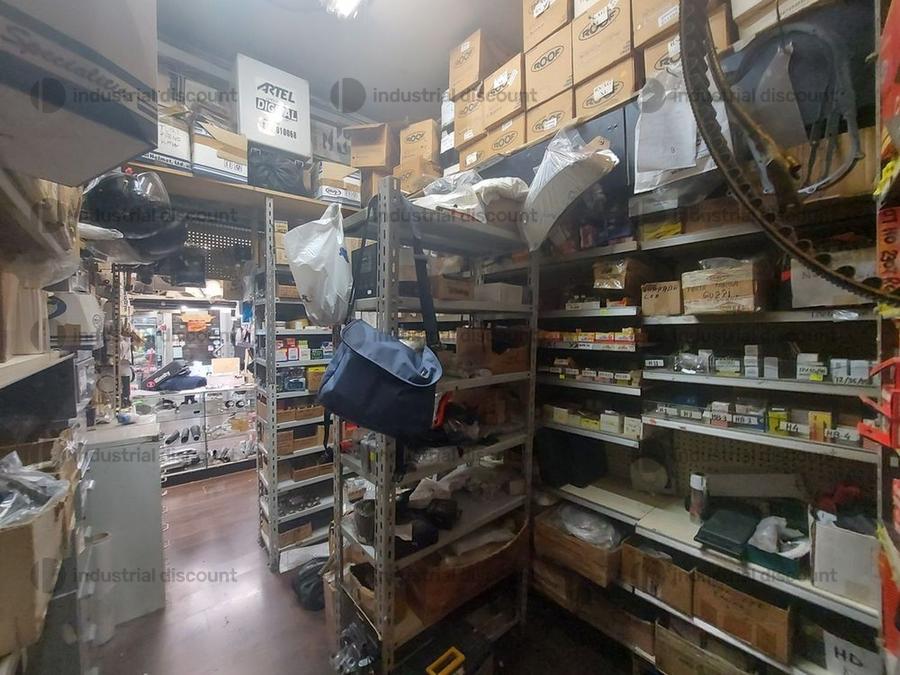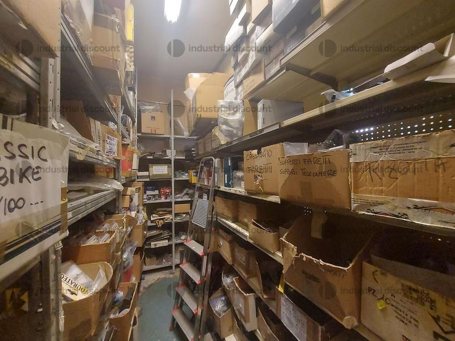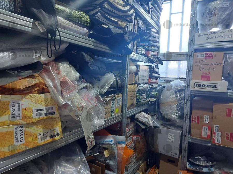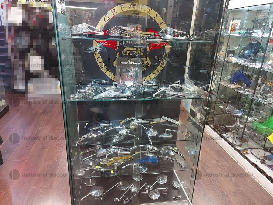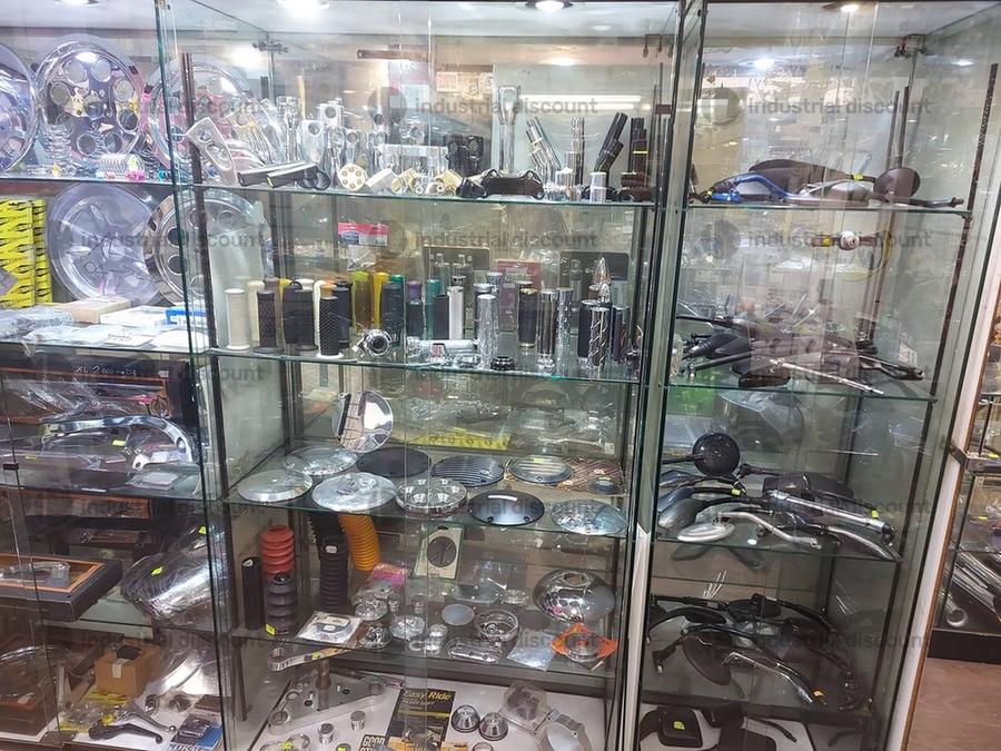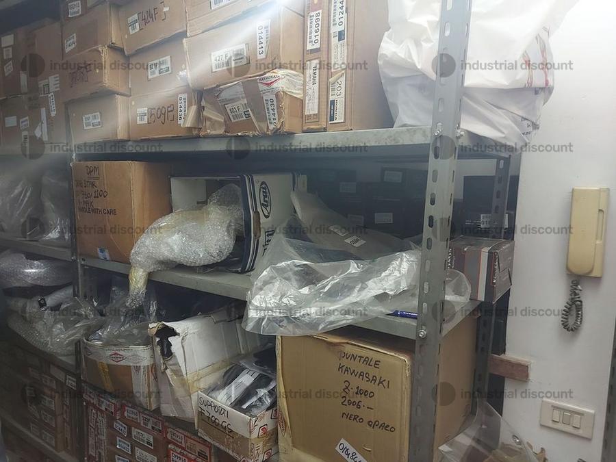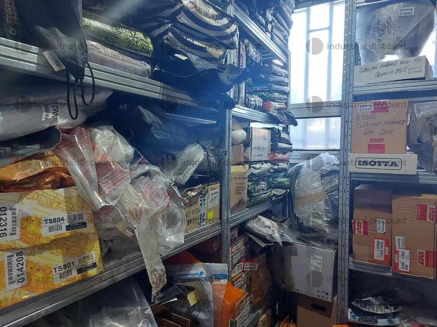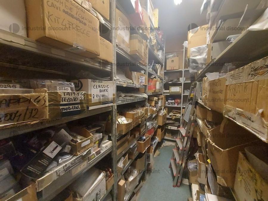 Accessori, ricambi per moto, comprensivi delle scaffalature che li contengono.