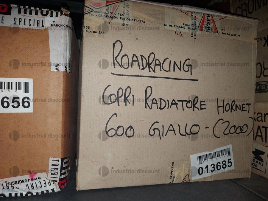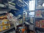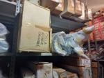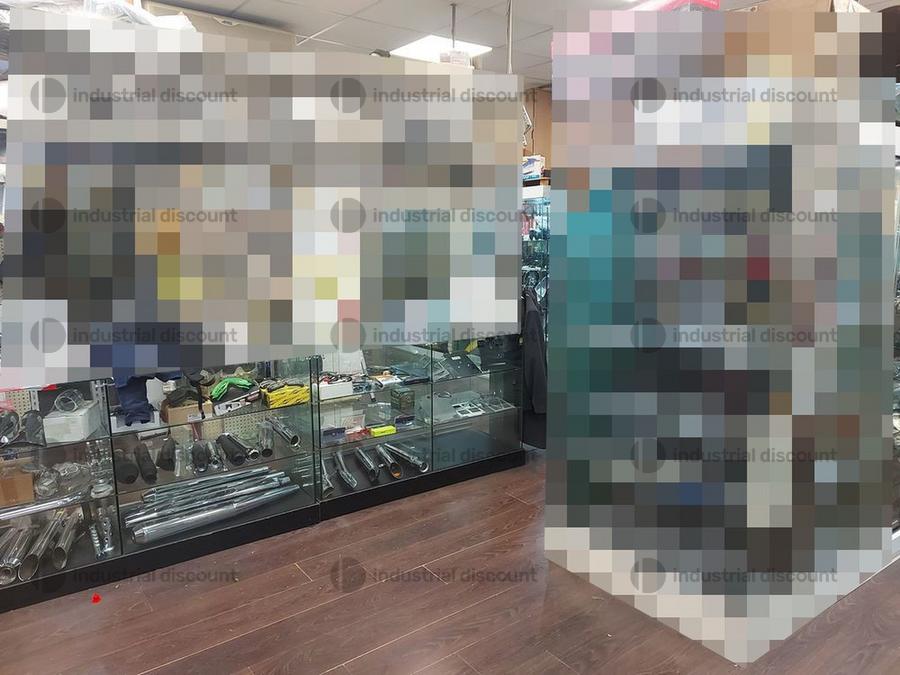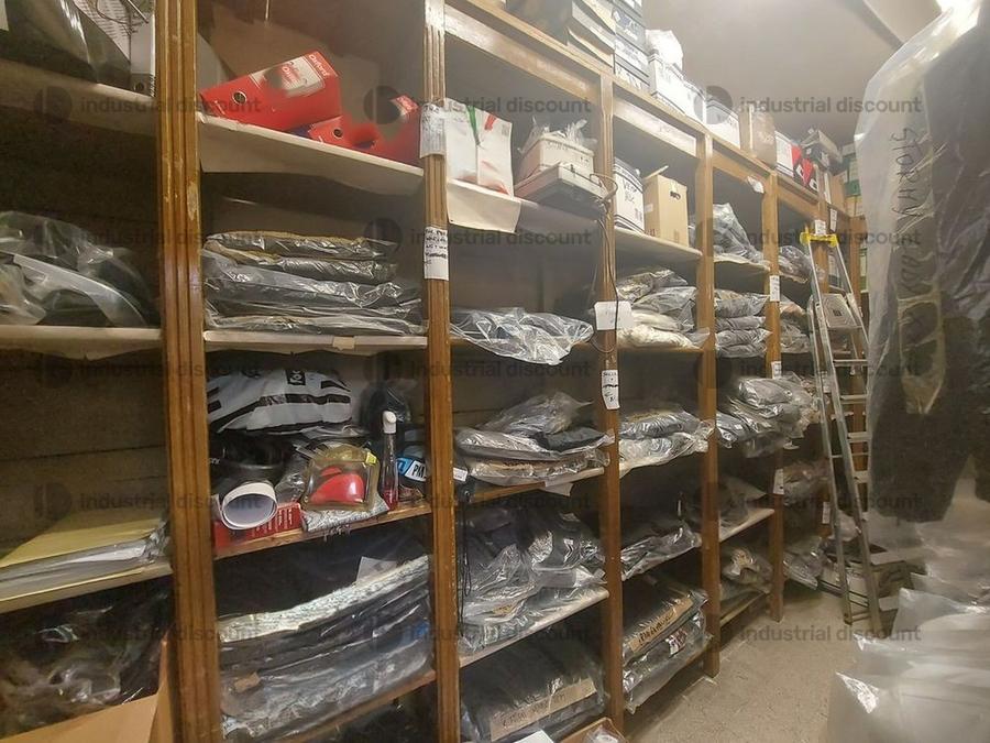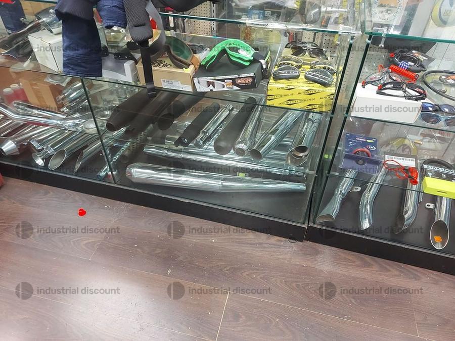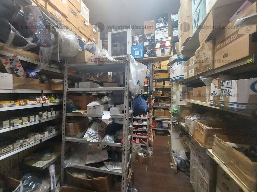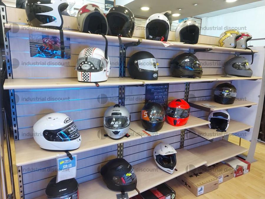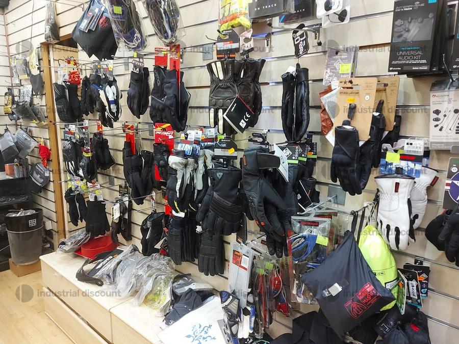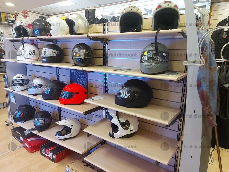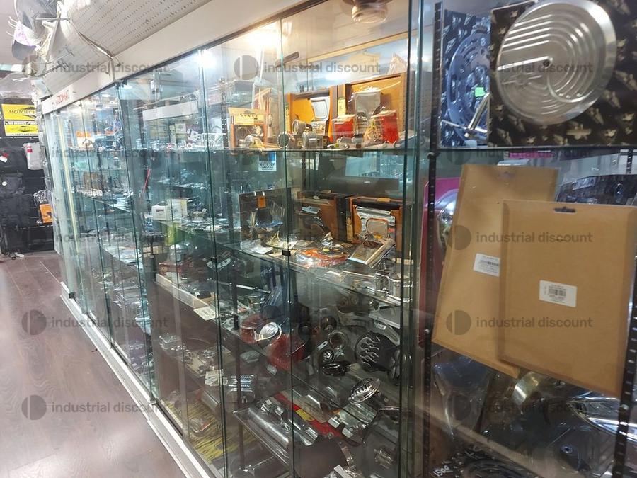 Accessori, ricambi per moto, comprensivi delle scaffalature che li contengono.