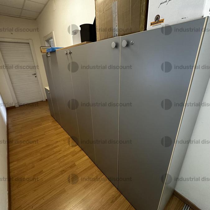 Arredamento per ufficio composto da:scrivania e cassettiera grigi;banco reception con cassettiera;divano in pelle nera;tavolo basso da esposizione in legno marrone;mobile basso archivio a sei ante e cassetti color wengè;n. 2 scrivanie, n.2 cassettiere, n. 2 sedie operative con ruote;armadio a muro bianco ad otto ante.NOTE VENDITA:- si segnala che i beni sono attualmente in utilizzo.NOTE PER RITIRO:- tempistica massima prevista per lo svolgimento delle attività di ritiro dal giorno concordato: 1 giorno