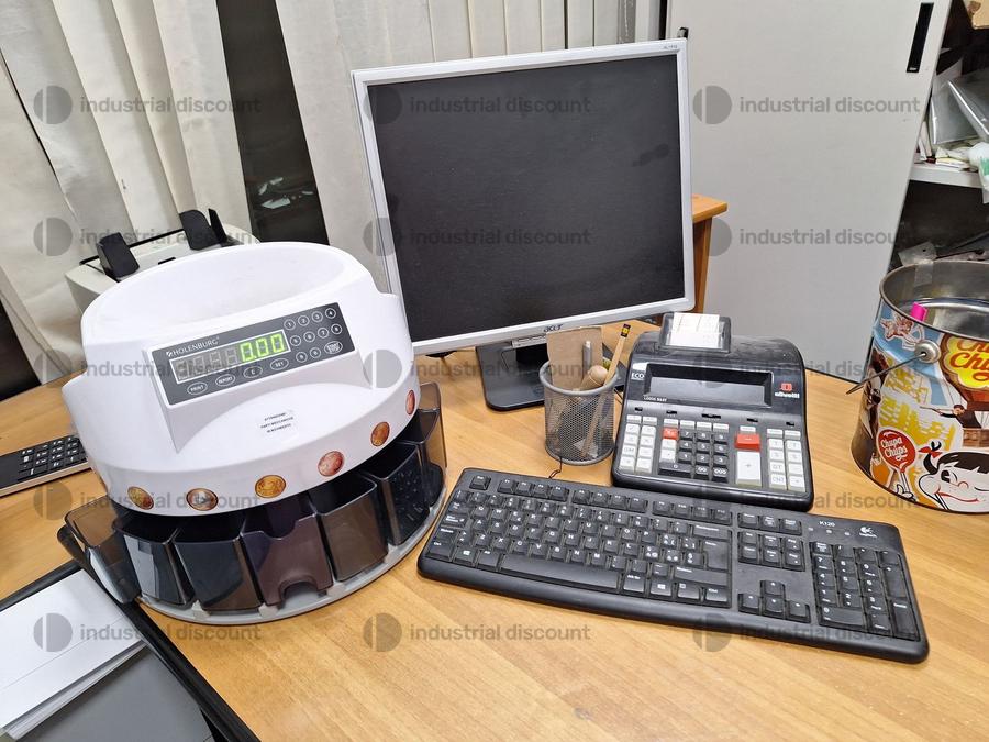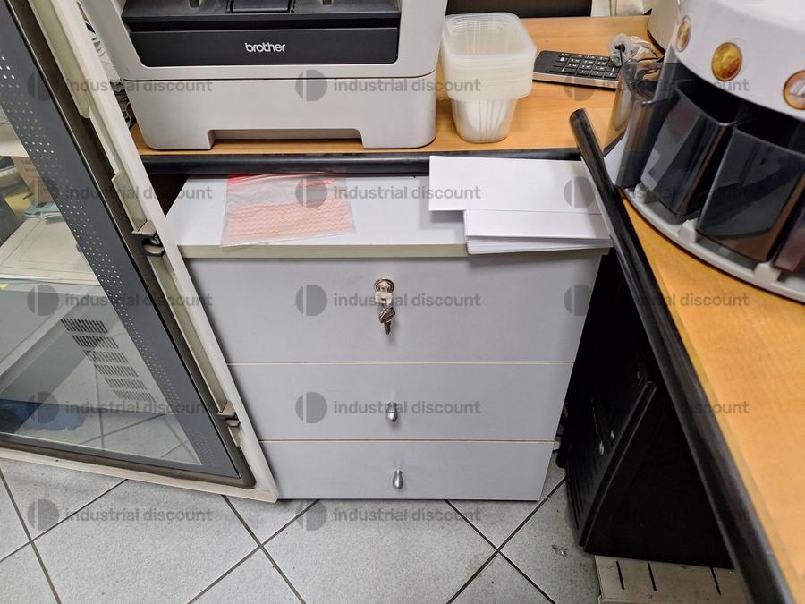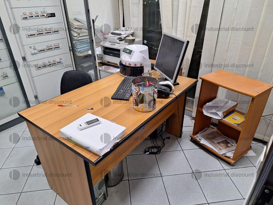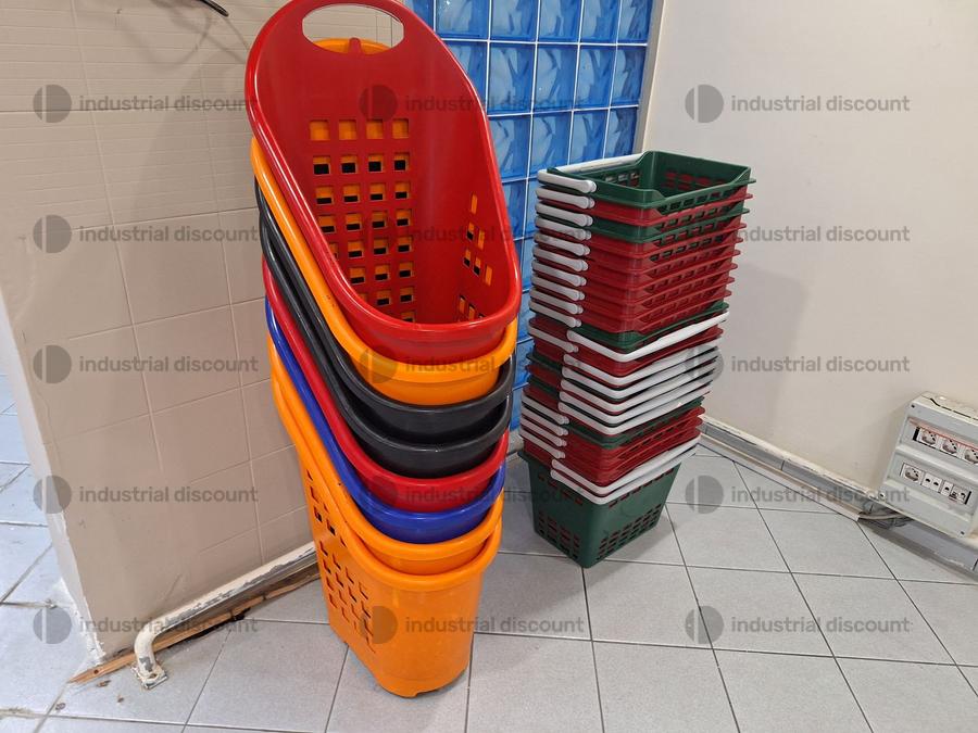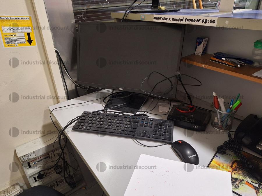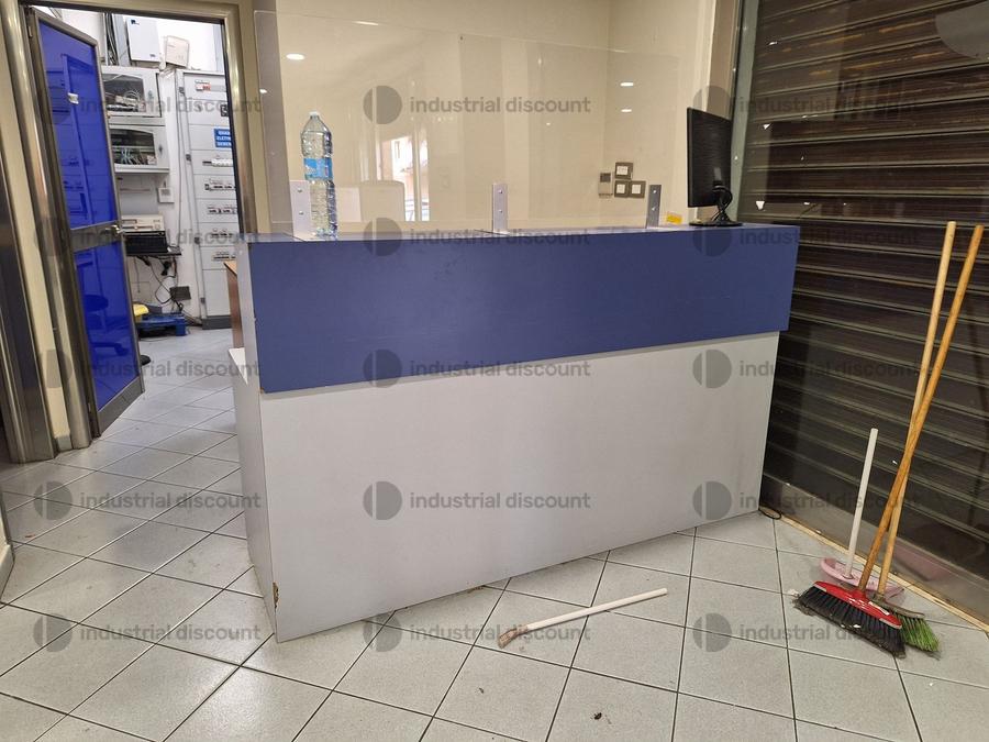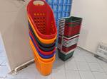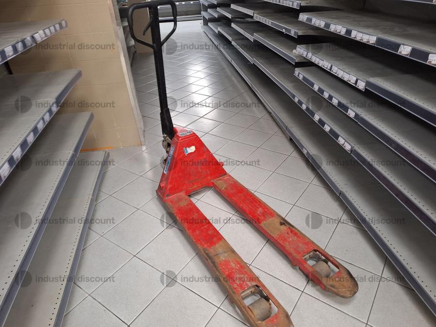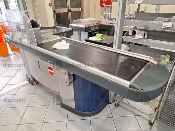 Lotto composto da arredi ed attrezzature varie per supermercati come postazioni cassa,transpallet, cestini, etc..