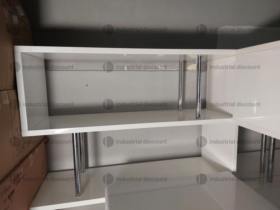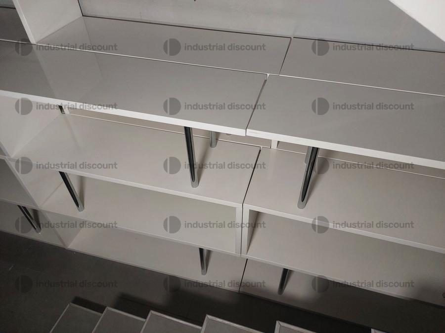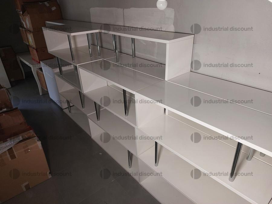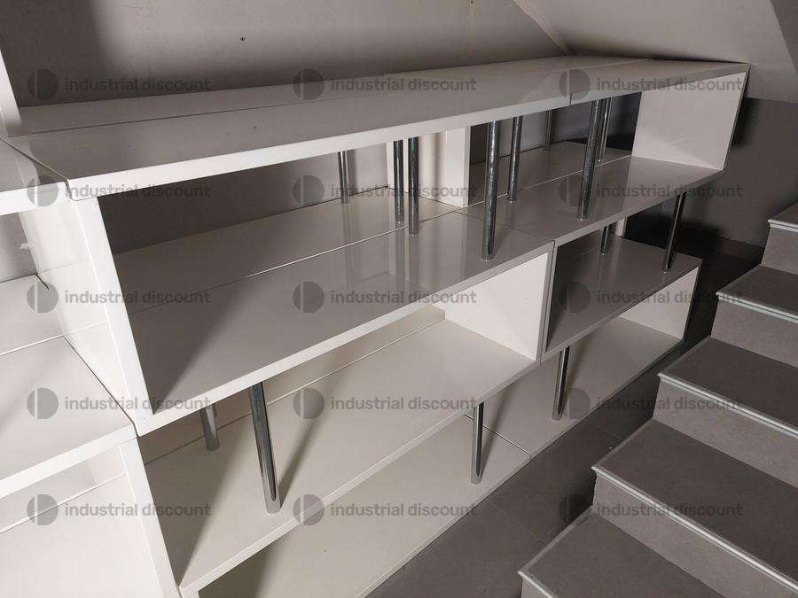 - n.4 espositori laccati bianchi con finiture cromate a cinque ripiani di lunghezza 120cm per altezza complessiva di 170cm;