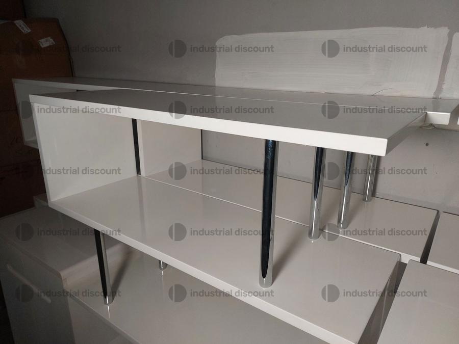 - n.5 espositori laccati bianchi con finiture cromate a quattro ripiani di lunghezza 120cm per altezza complessiva di 130cm