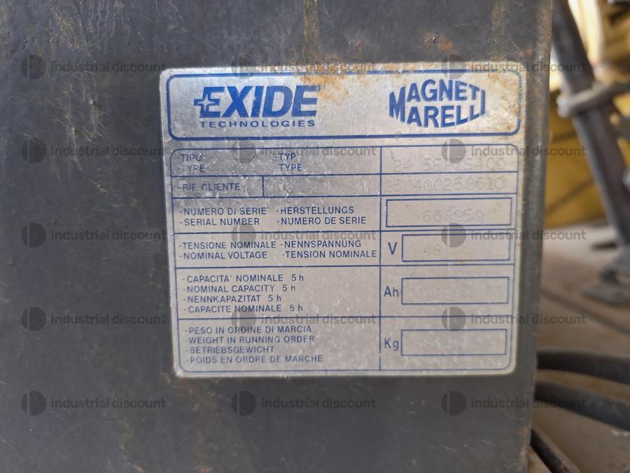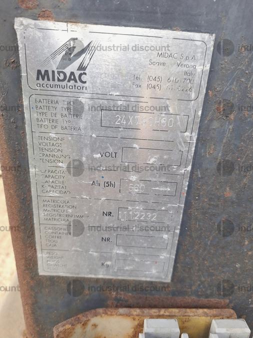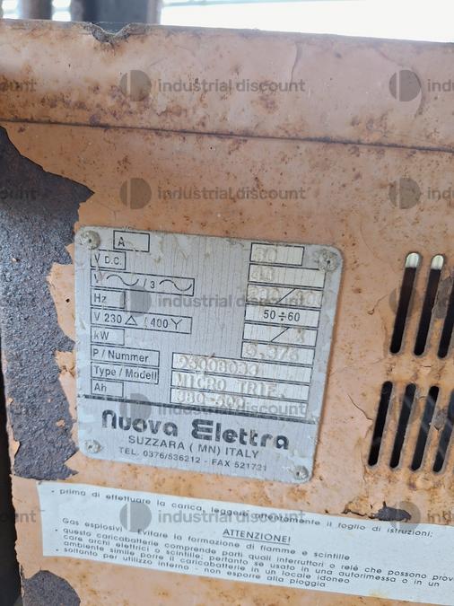 VENDITA DA AZIENDA ATTIVACarrello elevatore Capacità di carico 1000 kg Altezza di sollevamento 3000 mm Altezza massima di sollevamento 4010 mm Batteria 60 V / 150 Ah Peso batteria 200 kg Potenza motore di trazione 3 kW Potenza motore di sollevamento 2,5 kW Lunghezza forche 1070 mm Sono previsti costi di imballaggio, movimentazione a magazzino e carico su camion della merce pari a 10 €