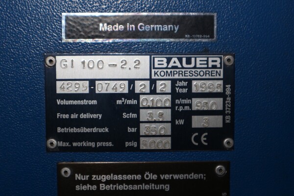 Compressore Bauer mod. GI100-2.2, anno 1995, matr. 4295-0749/2/2, 3 Kw, completo di quadro comandi