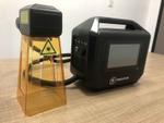 Strumento di marcatura laser alimentato a batteria, comodamente trasportabile, con cono di sicurezza per proteggere l'area di marcatura.