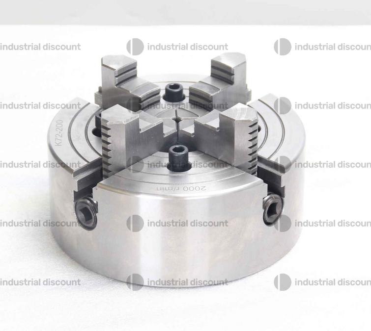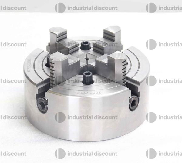 Diametro mandrino 200 mm con 4 ganasce indipendenti fino a 2100 giri/min. Foro 70 mm, interasse viti 112 mm (4 - M10). Altezza 75 mm, con griffe 107,5 mm.