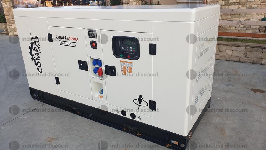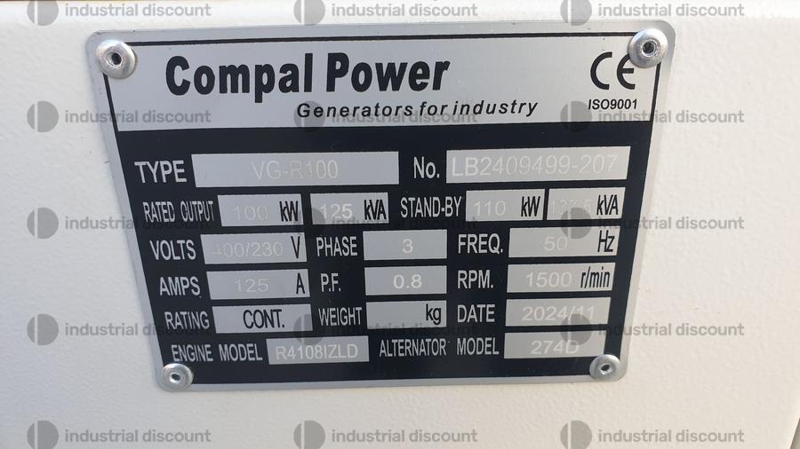 Gruppo elettrogeno Compal Power VG-R100, potenza 100 kW, motore marca ricardo 4 cilindri raffreddato ad acqua, dotato di sistema riduzione consumi, accensione elettrica automatica, pannello di controllo digitale, controllo elettronico della tensione, uscite 230/380 volt, usato 0 ore.