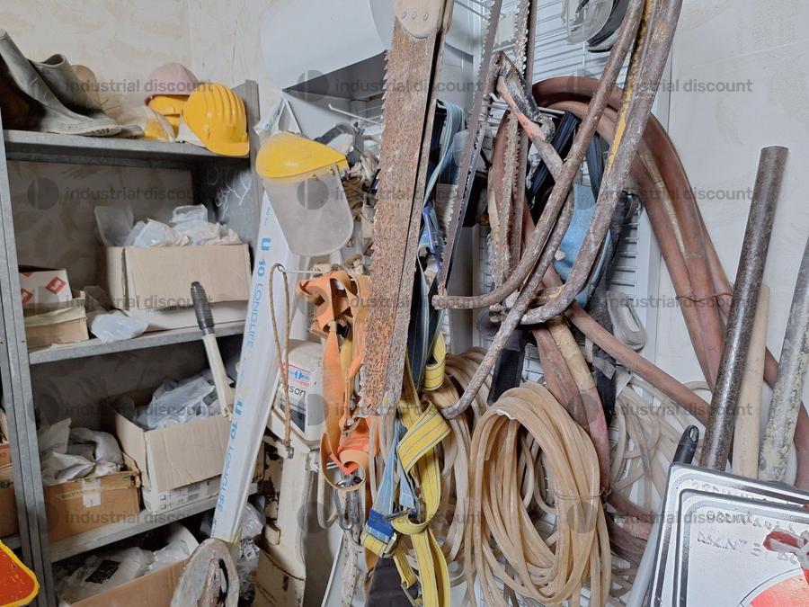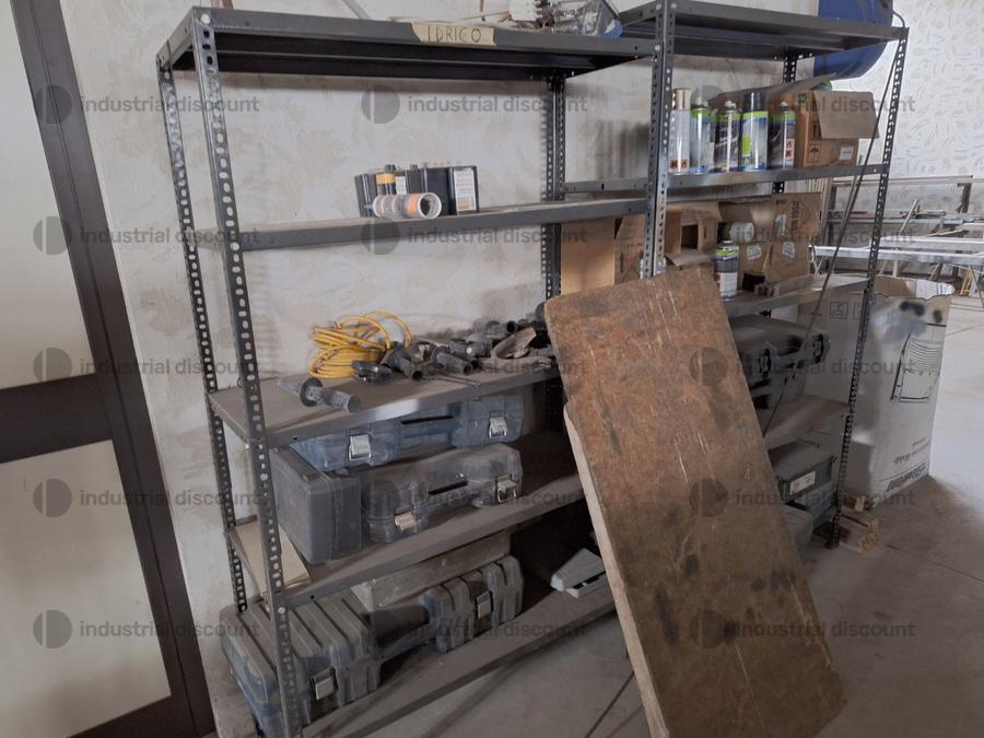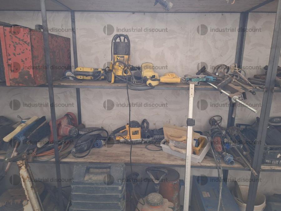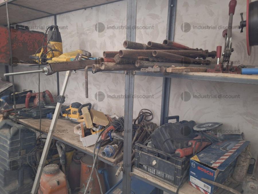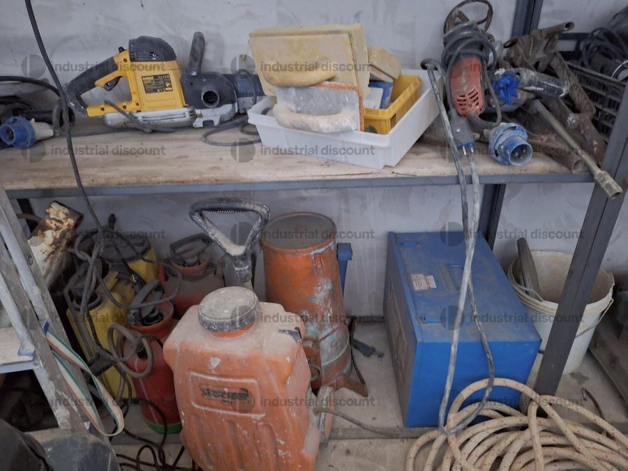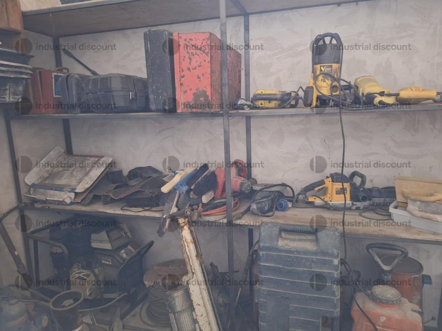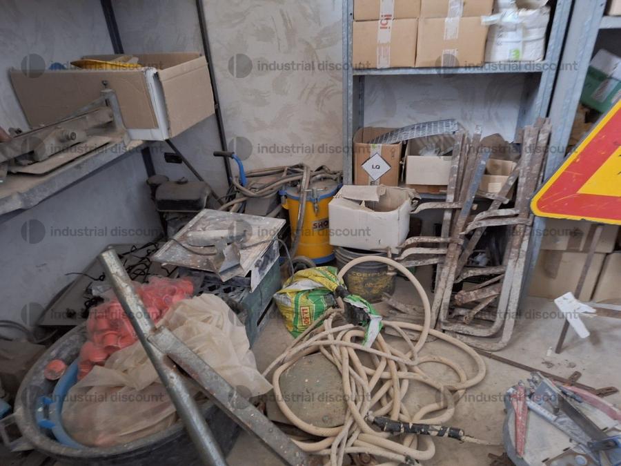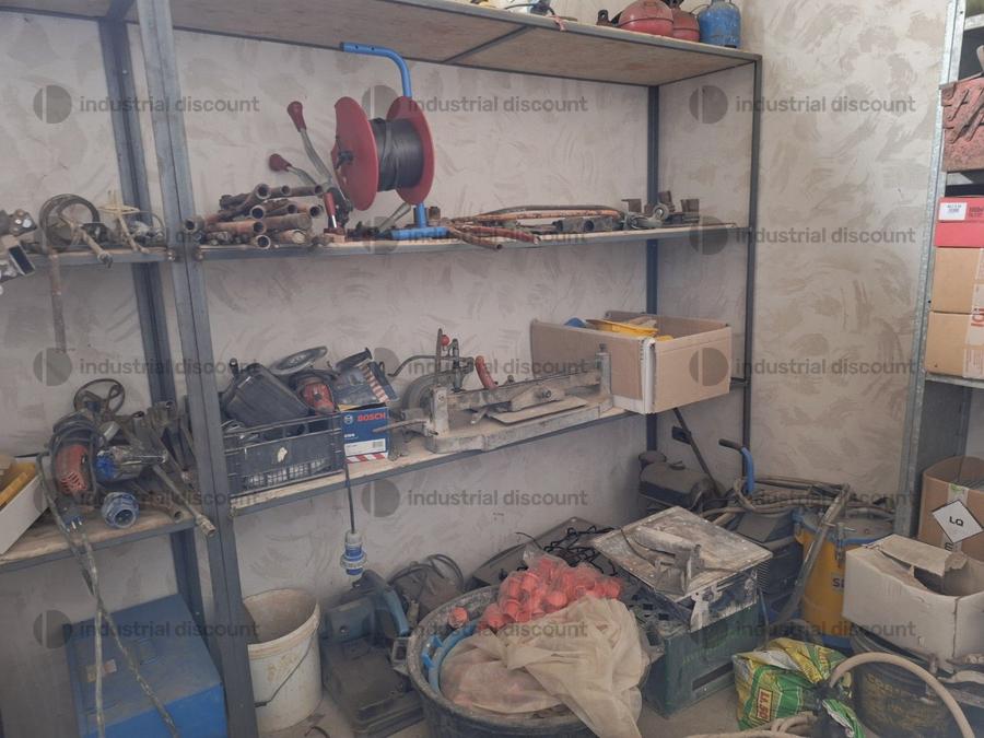 Macchinari attrezzature banchi di lavoro arredi di officina e giacenze di materiali edili idraulici ed elettrici.
