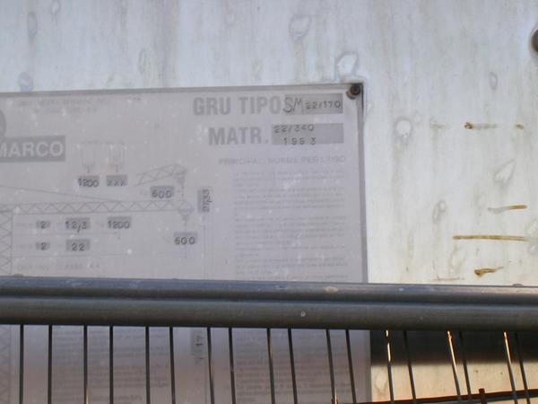 Gru automontante San Marco, modello 22/170, telaio 22/340, anno costruzione 1993, ultima manutenzione 2007.