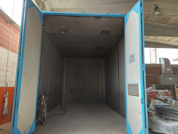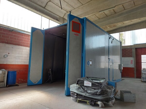 VENDITA DA AZIENDA ATTIVA Cabina di verniciatura a polvere struttura in acciaio verniciata completa di aspirazione e scuotimento filtri n. 3 cassoni con cartucce per possibilità cambio colore n. 2 contenitori con vibrazione per recupero polvere n. 2 contenitori polvere per pistole manuali n. 2 scalette Dimensioni cabina applicazione polvere altezza 3480 mm larghezza 1700 mm lunghezza 3900 mm Scarica i documenti dalla sezione documentazione lotto