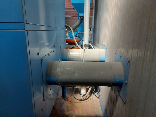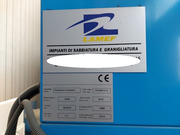 VENDITA DA AZIENDA ATTIVA Granigliatrice OMSG a tappeto rampante mod. SG/2/RNHmtr.10465, anno 2000 , Filtro autopulente tipo FAC 4/3/N, matr 10465, anno 2000, 4 cartucce filtranti, Portata aria aspirata 3000 m³/h