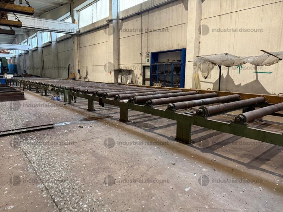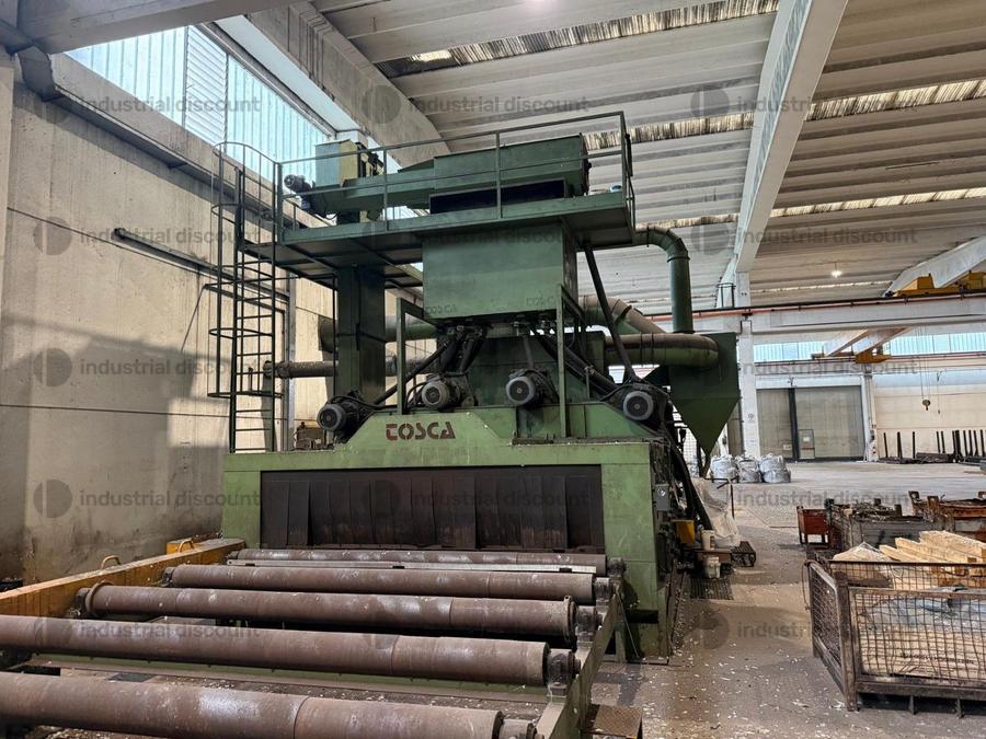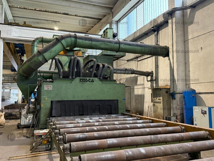 Macchina granigliatura TOSCA mod. TS/RP 30x5 con rulli ingresso-uscita, bilancini carico e scarico, presa magnetica e impianto aspirazione esterno, CE.