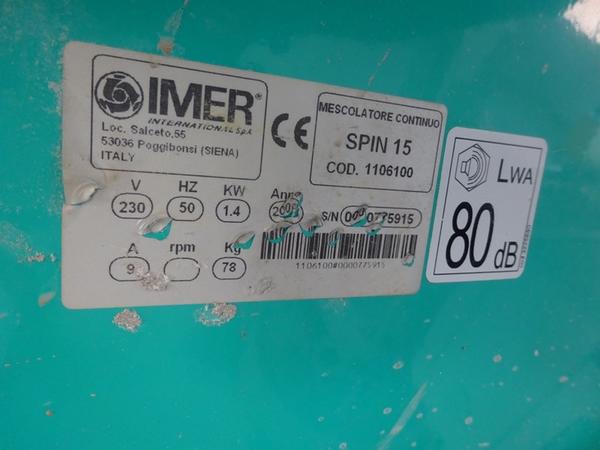 Mescolatore continuo Imer Spin 15, matricola 0000775915, anno (presunto, in quanto l'etichetta non è ben leggibile) 2005.