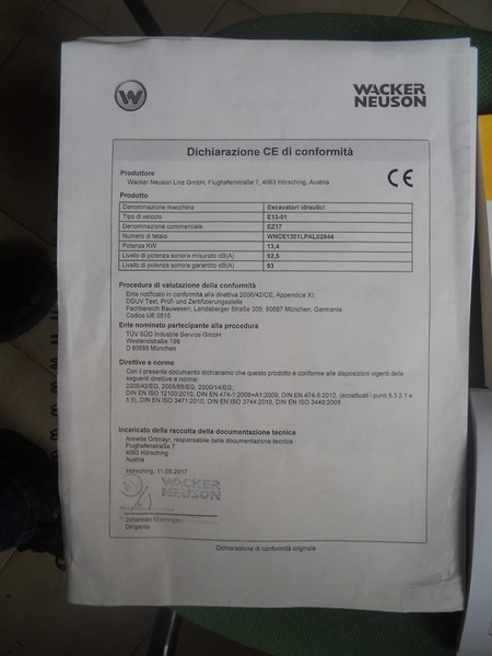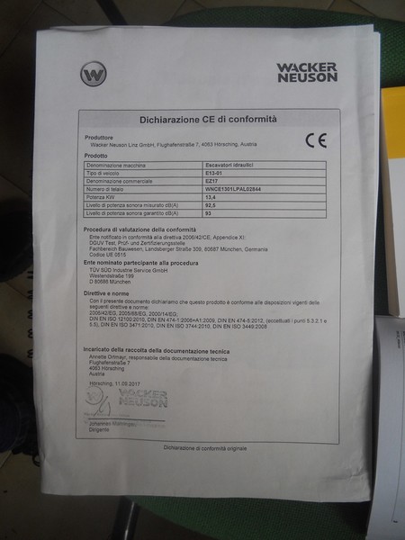 Mini escavatore Wacker Neuson, mod. EZ 17, da 13.40 kw, anno 2017. Mezzo in condizioni pari al nuovo con 8 ore di lavoro. Corredato da Manuale d'uso, manuale di assistenza e certificato CE. Completo di accessori: Benna Cangini da 300 mm, Benna Cangini da 600 mm, Benna Cangini da 1000 mm. Attacco rapido di tipo meccanico, martello demolitore OSA MB 100, tutto in condizione nuove e risalenti all'anno 2017.