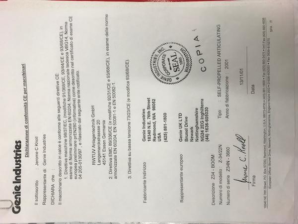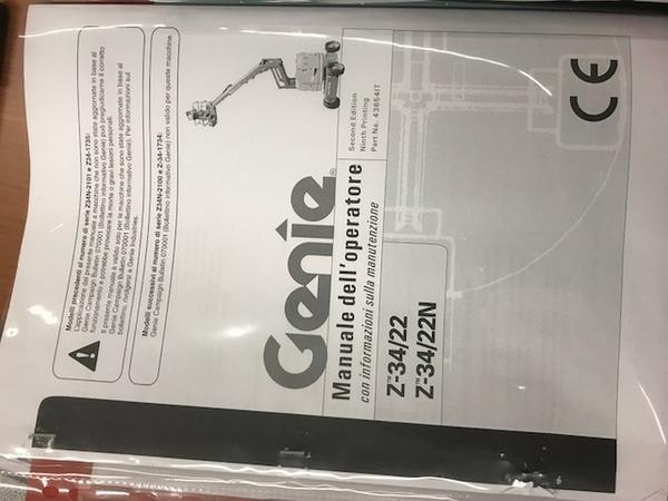 Piattaforma aerea semovente cestello della ditta Genie modello Z-34/22N, numero seriale Z34N-3660, modello anno 2002, portata massima 227 kg. Altezza massima da terra mt. 10,40, batteria non funzionante il guasto al cestello è stato risolto. Il bene si trova a Bertinoro.