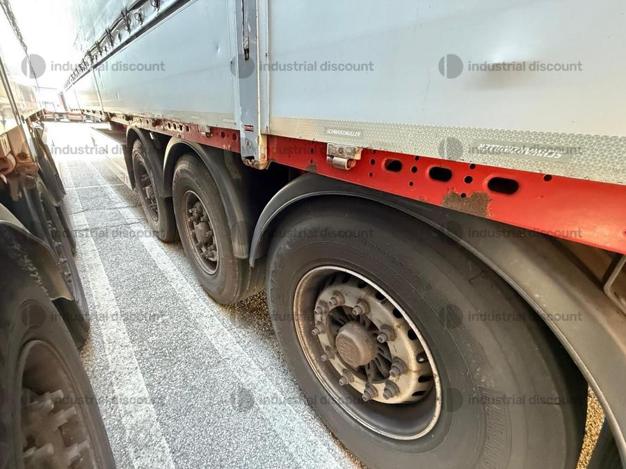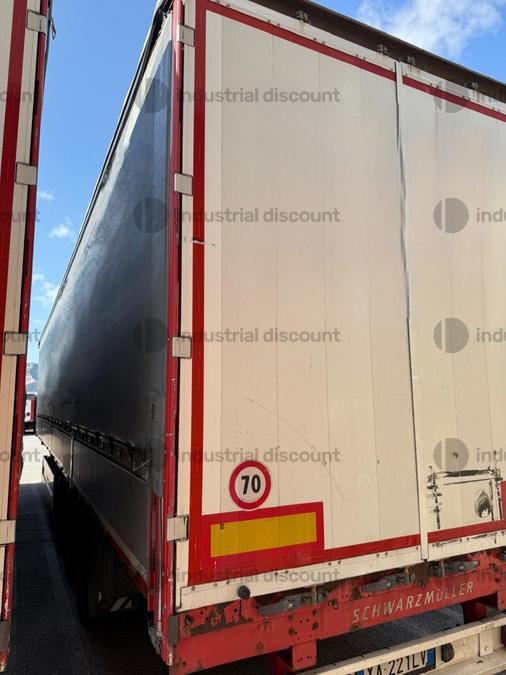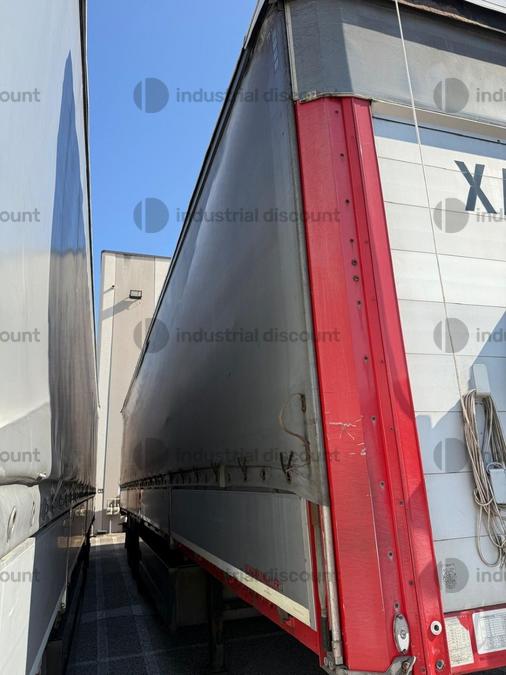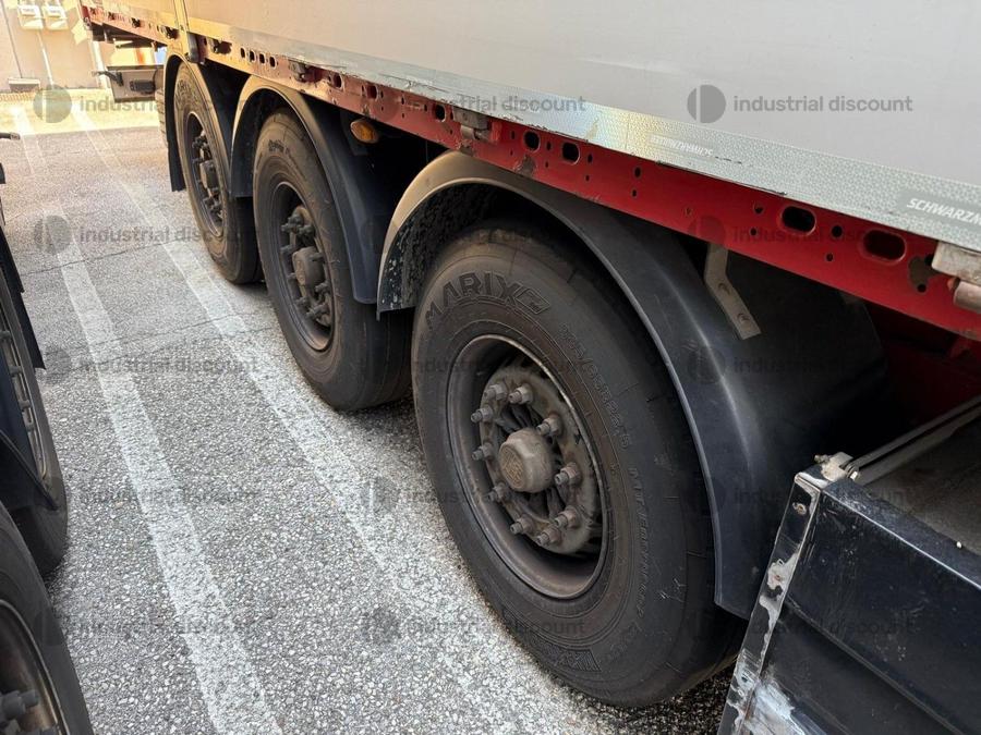 VENDITA DA AZIENDA ATTIVARimorchio Schmitz SO1 centinato alla franceseTargato AE22421Assali fissi Saf freno a disco, sospensioni pneumatiche, protezione posteriore paraincastro, mezzi parafanghi, luci laterali di ingombro, protezioni laterali para ciclisti, pannelli retro riflettenti. N. 6 pneumatici 385/65 R22.5 con 6 cerchi, porta cunei con cunei, porta ruota di scorta doppio a cesto. Nr. 2 Cassetti attrezzi. Dimensioni: lunghezza esterna: 13.900 mmlarghezza esterna: 2.550 mmTelaio zincato, fondo in pannello multistrato, ganci per ancoraggio del carico.Sponda anteriore para cabina altezza max rinforzata con lamiera interna. Piantoni centrali scorrevoli (3 + 3), nr. 2 file listelli laterali in lega, centina alza abbassa manuale idraulica a pompetta con spalliere laterali in alluminio (trave a L) tetto copri scopri, paracolpi posteriore. Porte posteriori gran Volume in lega leggera con 4 chiusure interne. Teli laterali scorrevoli colore nero. Chiusure con cricchetti e con tenditelo.