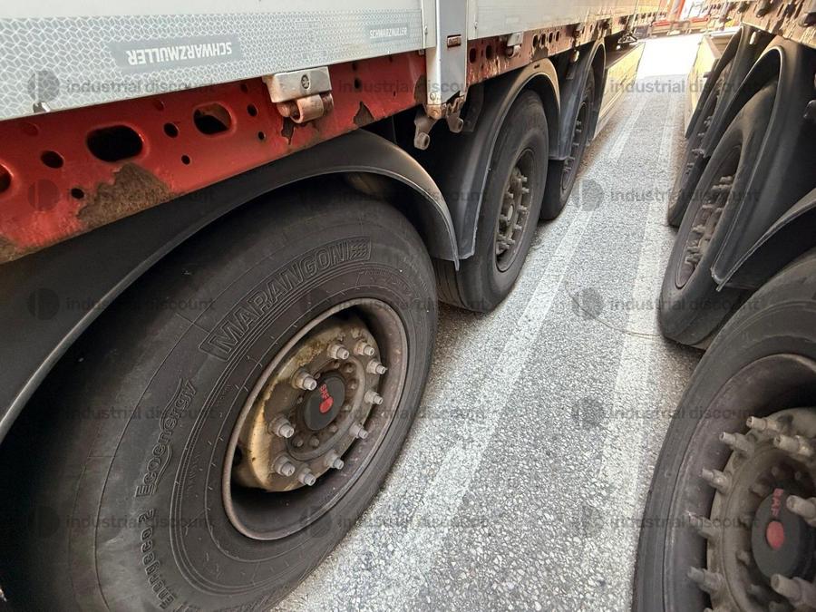VENDITA DA AZIENDA ATTIVARimorchio Schmitz SO1 centinato alla franceseTargato AE22421Assali fissi Saf freno a disco, sospensioni pneumatiche, protezione posteriore paraincastro, mezzi parafanghi, luci laterali di ingombro, protezioni laterali para ciclisti, pannelli retro riflettenti. N. 6 pneumatici 385/65 R22.5 con 6 cerchi, porta cunei con cunei, porta ruota di scorta doppio a cesto. Nr. 2 Cassetti attrezzi. Dimensioni: lunghezza esterna: 13.900 mmlarghezza esterna: 2.550 mmTelaio zincato, fondo in pannello multistrato, ganci per ancoraggio del carico.Sponda anteriore para cabina altezza max rinforzata con lamiera interna. Piantoni centrali scorrevoli (3 + 3), nr. 2 file listelli laterali in lega, centina alza abbassa manuale idraulica a pompetta con spalliere laterali in alluminio (trave a L) tetto copri scopri, paracolpi posteriore. Porte posteriori gran Volume in lega leggera con 4 chiusure interne. Teli laterali scorrevoli colore nero. Chiusure con cricchetti e con tenditelo.