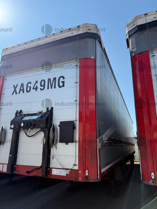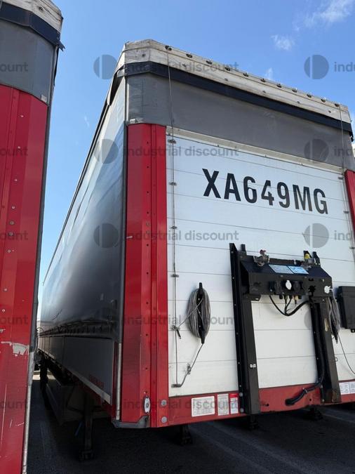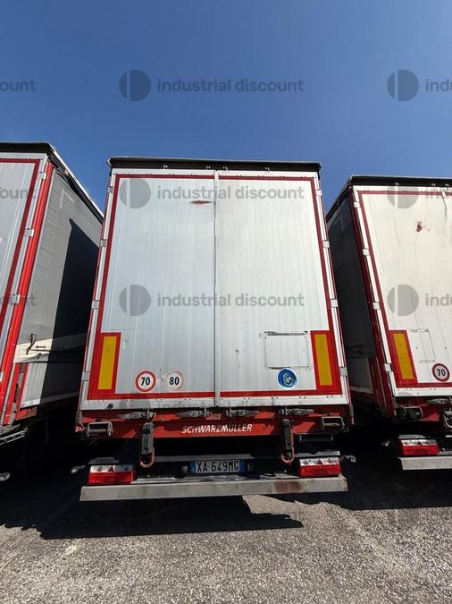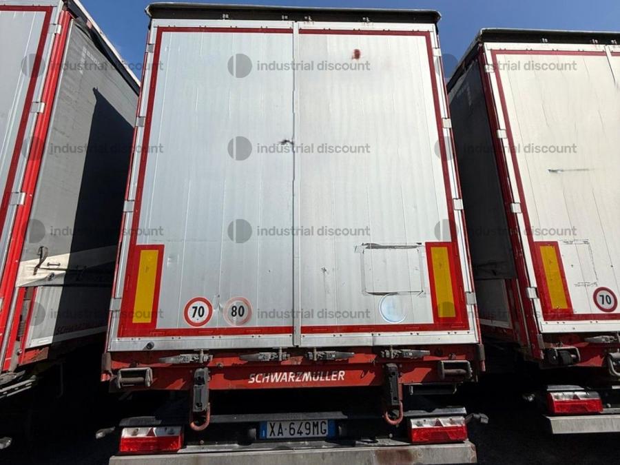 VENDITA DA AZIENDA ATTIVARimorchio Schmitz SO1 centinato alla franceseTargato AE22421Assali fissi Saf freno a disco, sospensioni pneumatiche, protezione posteriore paraincastro, mezzi parafanghi, luci laterali di ingombro, protezioni laterali para ciclisti, pannelli retro riflettenti. N. 6 pneumatici 385/65 R22.5 con 6 cerchi, porta cunei con cunei, porta ruota di scorta doppio a cesto. Nr. 2 Cassetti attrezzi. Dimensioni: lunghezza esterna: 13.900 mmlarghezza esterna: 2.550 mmTelaio zincato, fondo in pannello multistrato, ganci per ancoraggio del carico.Sponda anteriore para cabina altezza max rinforzata con lamiera interna. Piantoni centrali scorrevoli (3 + 3), nr. 2 file listelli laterali in lega, centina alza abbassa manuale idraulica a pompetta con spalliere laterali in alluminio (trave a L) tetto copri scopri, paracolpi posteriore. Porte posteriori gran Volume in lega leggera con 4 chiusure interne. Teli laterali scorrevoli colore nero. Chiusure con cricchetti e con tenditelo.