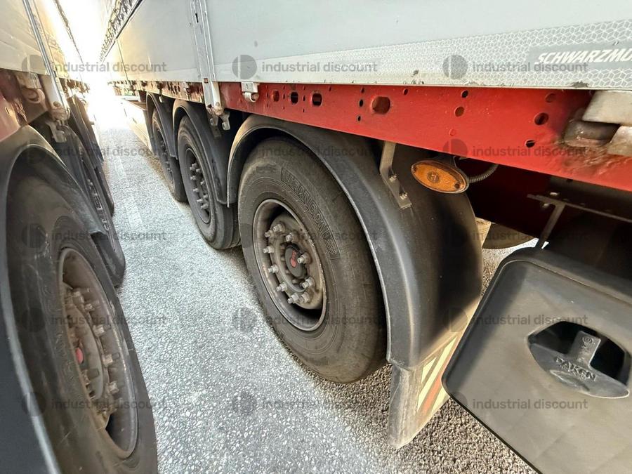 VENDITA DA AZIENDA ATTIVARimorchio Schmitz SO1 centinato alla franceseTargato AE22421Assali fissi Saf freno a disco, sospensioni pneumatiche, protezione posteriore paraincastro, mezzi parafanghi, luci laterali di ingombro, protezioni laterali para ciclisti, pannelli retro riflettenti. N. 6 pneumatici 385/65 R22.5 con 6 cerchi, porta cunei con cunei, porta ruota di scorta doppio a cesto. Nr. 2 Cassetti attrezzi. Dimensioni: lunghezza esterna: 13.900 mmlarghezza esterna: 2.550 mmTelaio zincato, fondo in pannello multistrato, ganci per ancoraggio del carico.Sponda anteriore para cabina altezza max rinforzata con lamiera interna. Piantoni centrali scorrevoli (3 + 3), nr. 2 file listelli laterali in lega, centina alza abbassa manuale idraulica a pompetta con spalliere laterali in alluminio (trave a L) tetto copri scopri, paracolpi posteriore. Porte posteriori gran Volume in lega leggera con 4 chiusure interne. Teli laterali scorrevoli colore nero. Chiusure con cricchetti e con tenditelo.