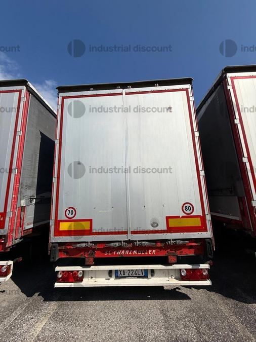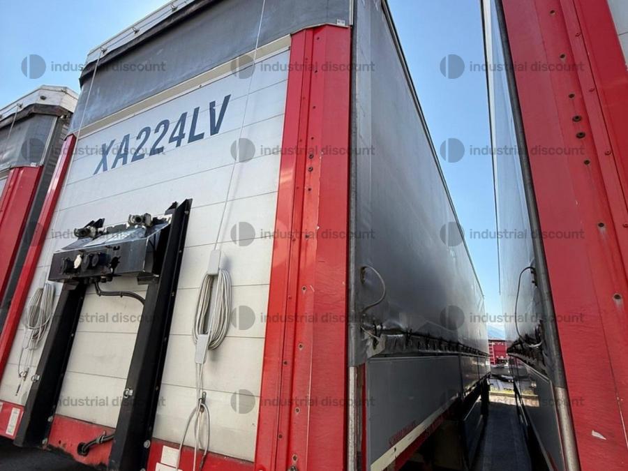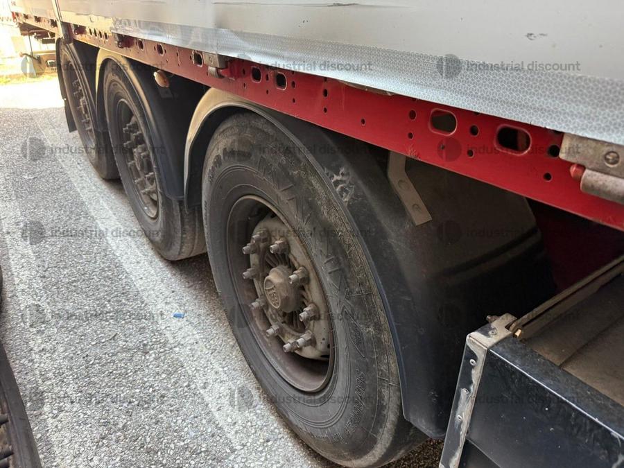 VENDITA DA AZIENDA ATTIVARimorchio Schmitz SO1 centinato alla franceseTargato AE22421Assali fissi Saf freno a disco, sospensioni pneumatiche, protezione posteriore paraincastro, mezzi parafanghi, luci laterali di ingombro, protezioni laterali para ciclisti, pannelli retro riflettenti. N. 6 pneumatici 385/65 R22.5 con 6 cerchi, porta cunei con cunei, porta ruota di scorta doppio a cesto. Nr. 2 Cassetti attrezzi. Dimensioni: lunghezza esterna: 13.900 mmlarghezza esterna: 2.550 mmTelaio zincato, fondo in pannello multistrato, ganci per ancoraggio del carico.Sponda anteriore para cabina altezza max rinforzata con lamiera interna. Piantoni centrali scorrevoli (3 + 3), nr. 2 file listelli laterali in lega, centina alza abbassa manuale idraulica a pompetta con spalliere laterali in alluminio (trave a L) tetto copri scopri, paracolpi posteriore. Porte posteriori gran Volume in lega leggera con 4 chiusure interne. Teli laterali scorrevoli colore nero. Chiusure con cricchetti e con tenditelo.