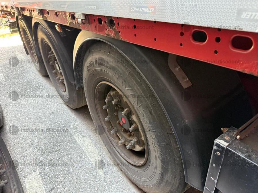 VENDITA DA AZIENDA ATTIVARimorchio Schmitz SO1 centinato alla franceseTargato AE22421Assali fissi Saf freno a disco, sospensioni pneumatiche, protezione posteriore paraincastro, mezzi parafanghi, luci laterali di ingombro, protezioni laterali para ciclisti, pannelli retro riflettenti. N. 6 pneumatici 385/65 R22.5 con 6 cerchi, porta cunei con cunei, porta ruota di scorta doppio a cesto. Nr. 2 Cassetti attrezzi. Dimensioni: lunghezza esterna: 13.900 mmlarghezza esterna: 2.550 mmTelaio zincato, fondo in pannello multistrato, ganci per ancoraggio del carico.Sponda anteriore para cabina altezza max rinforzata con lamiera interna. Piantoni centrali scorrevoli (3 + 3), nr. 2 file listelli laterali in lega, centina alza abbassa manuale idraulica a pompetta con spalliere laterali in alluminio (trave a L) tetto copri scopri, paracolpi posteriore. Porte posteriori gran Volume in lega leggera con 4 chiusure interne. Teli laterali scorrevoli colore nero. Chiusure con cricchetti e con tenditelo.