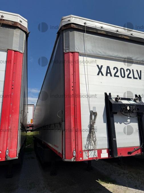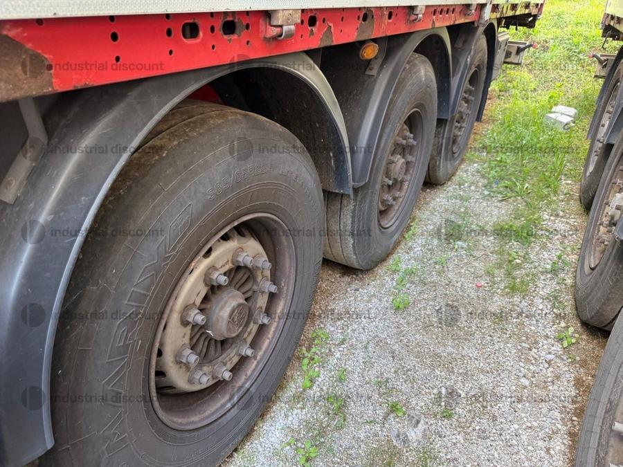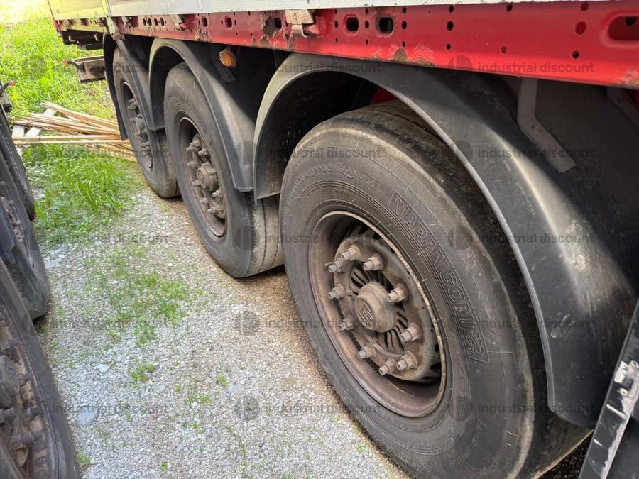 VENDITA DA AZIENDA ATTIVARimorchio Schmitz SO1 centinato alla franceseTargato AE22421Assali fissi Saf freno a disco, sospensioni pneumatiche, protezione posteriore paraincastro, mezzi parafanghi, luci laterali di ingombro, protezioni laterali para ciclisti, pannelli retro riflettenti. N. 6 pneumatici 385/65 R22.5 con 6 cerchi, porta cunei con cunei, porta ruota di scorta doppio a cesto. Nr. 2 Cassetti attrezzi. Dimensioni: lunghezza esterna: 13.900 mmlarghezza esterna: 2.550 mmTelaio zincato, fondo in pannello multistrato, ganci per ancoraggio del carico.Sponda anteriore para cabina altezza max rinforzata con lamiera interna. Piantoni centrali scorrevoli (3 + 3), nr. 2 file listelli laterali in lega, centina alza abbassa manuale idraulica a pompetta con spalliere laterali in alluminio (trave a L) tetto copri scopri, paracolpi posteriore. Porte posteriori gran Volume in lega leggera con 4 chiusure interne. Teli laterali scorrevoli colore nero. Chiusure con cricchetti e con tenditelo.