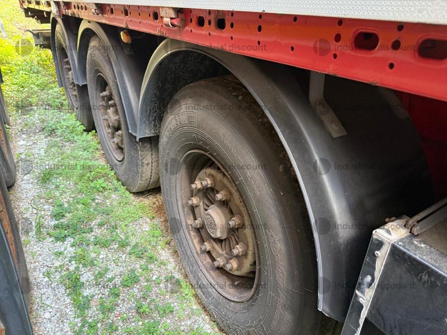 VENDITA DA AZIENDA ATTIVARimorchio Schmitz SO1 centinato alla franceseTargato AE22421Assali fissi Saf freno a disco, sospensioni pneumatiche, protezione posteriore paraincastro, mezzi parafanghi, luci laterali di ingombro, protezioni laterali para ciclisti, pannelli retro riflettenti. N. 6 pneumatici 385/65 R22.5 con 6 cerchi, porta cunei con cunei, porta ruota di scorta doppio a cesto. Nr. 2 Cassetti attrezzi. Dimensioni: lunghezza esterna: 13.900 mmlarghezza esterna: 2.550 mmTelaio zincato, fondo in pannello multistrato, ganci per ancoraggio del carico.Sponda anteriore para cabina altezza max rinforzata con lamiera interna. Piantoni centrali scorrevoli (3 + 3), nr. 2 file listelli laterali in lega, centina alza abbassa manuale idraulica a pompetta con spalliere laterali in alluminio (trave a L) tetto copri scopri, paracolpi posteriore. Porte posteriori gran Volume in lega leggera con 4 chiusure interne. Teli laterali scorrevoli colore nero. Chiusure con cricchetti e con tenditelo.