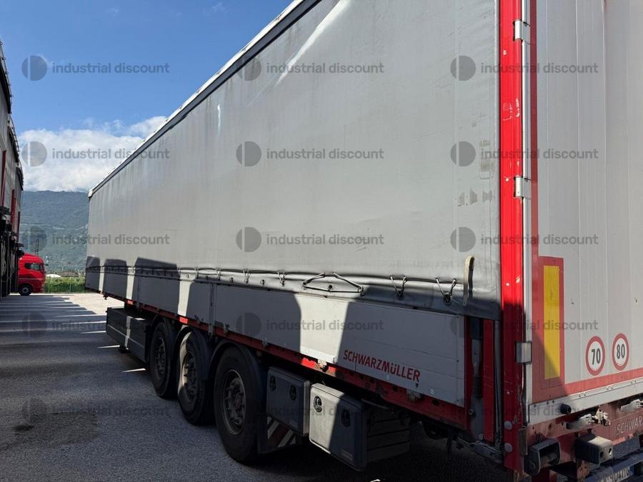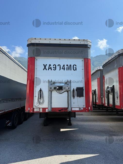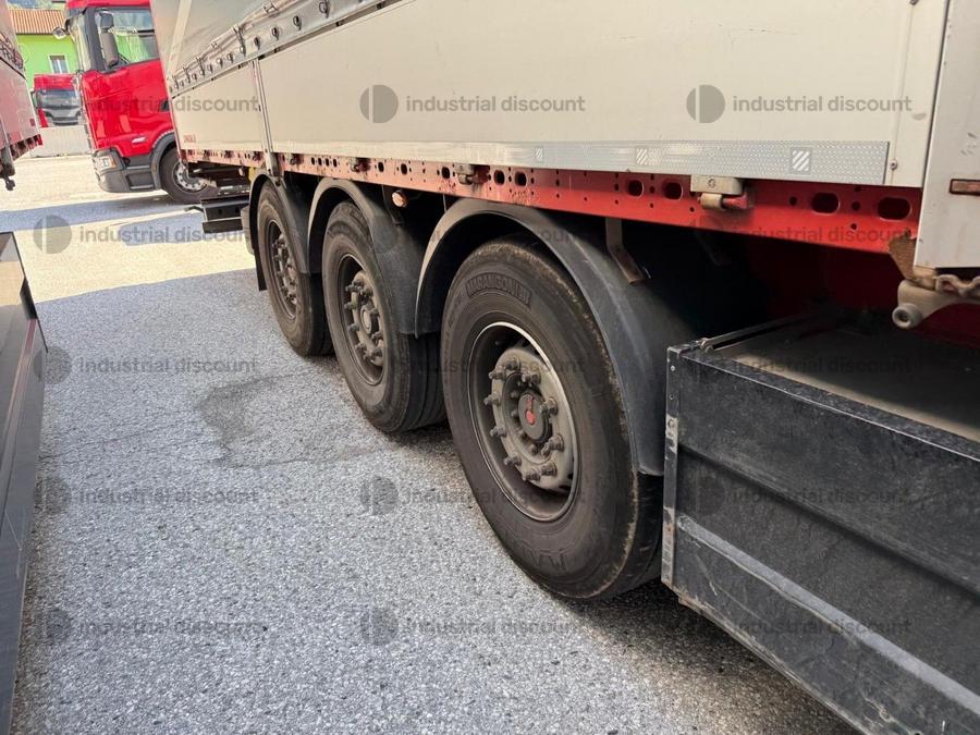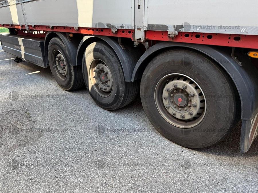 VENDITA DA AZIENDA ATTIVARimorchio Schmitz SO1 centinato alla franceseTargato AE22421Assali fissi Saf freno a disco, sospensioni pneumatiche, protezione posteriore paraincastro, mezzi parafanghi, luci laterali di ingombro, protezioni laterali para ciclisti, pannelli retro riflettenti. N. 6 pneumatici 385/65 R22.5 con 6 cerchi, porta cunei con cunei, porta ruota di scorta doppio a cesto. Nr. 2 Cassetti attrezzi. Dimensioni: lunghezza esterna: 13.900 mmlarghezza esterna: 2.550 mmTelaio zincato, fondo in pannello multistrato, ganci per ancoraggio del carico.Sponda anteriore para cabina altezza max rinforzata con lamiera interna. Piantoni centrali scorrevoli (3 + 3), nr. 2 file listelli laterali in lega, centina alza abbassa manuale idraulica a pompetta con spalliere laterali in alluminio (trave a L) tetto copri scopri, paracolpi posteriore. Porte posteriori gran Volume in lega leggera con 4 chiusure interne. Teli laterali scorrevoli colore nero. Chiusure con cricchetti e con tenditelo.